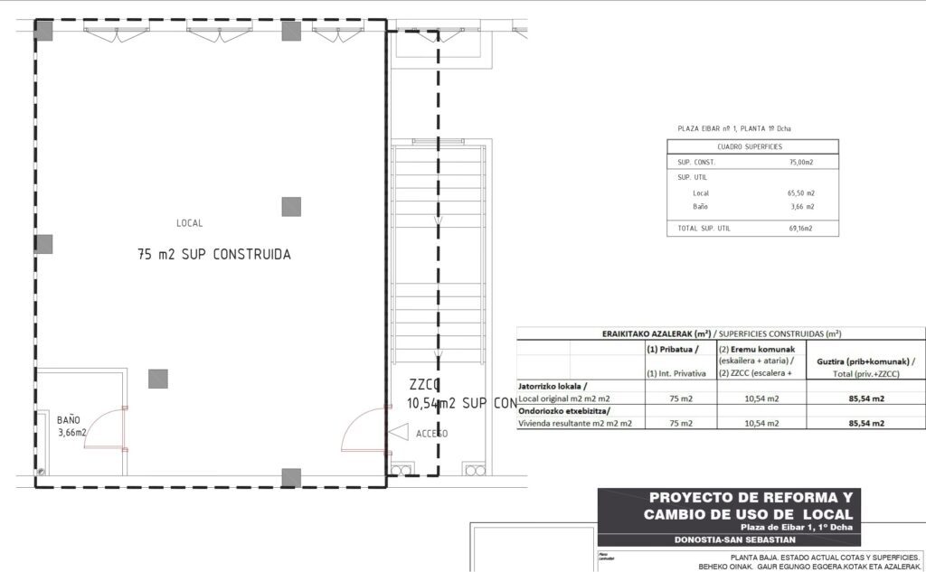 El proyecto contempla la reforma interior y el cambio de uso de un local existente para su transformación en vivienda, situado en planta primera de un edificio residencial del Ensanche de Amara, con acceso desde la calle Ontziola y fachada hacia la Plaza de Eibar, en Donostia–San Sebastián.