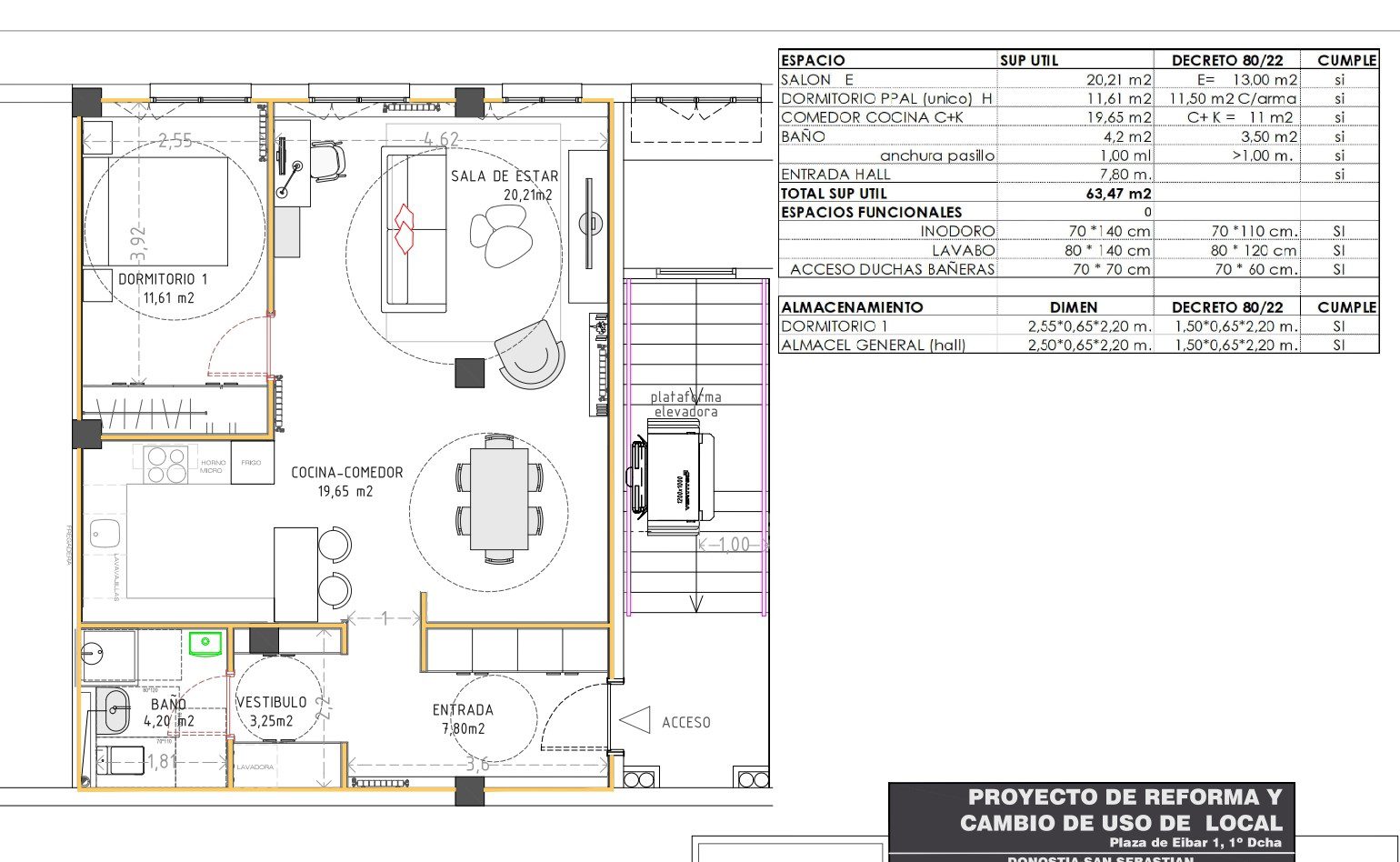 El proyecto justifica el cumplimiento del Decreto 80/2022 de condiciones mínimas de habitabilidad del País Vasco, así como de los documentos básicos del CTE en materia de seguridad de utilización, salubridad, protección frente al ruido, seguridad en caso de incendio y ahorro de energía, dentro del alcance propio de una reforma en edificio existente.